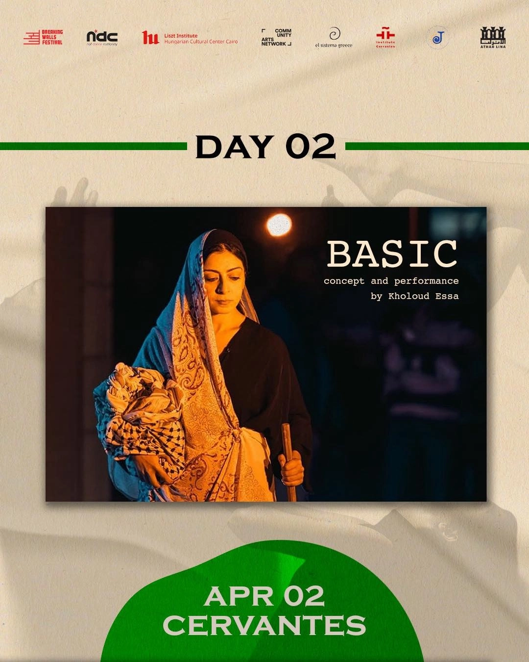العرض الأول بعنوان “رأساً على عقب” للفنانة كيندال كرامر، وهو عمل قصير (٨ دقائق) يستكشف رحلة وجدانية بين الندم والفهم، حيث تتحول أخطاء الماضي إلى وعي جديد وفرص للتواصل الأعمق مع الذات والآخرين. أما العرض الثاني “علامة استفهام” (٣٠ دقيقة) للفنان خالد جيكا، فيأخذ الجمهور في رحلة مسرحية ارتجالية تبدأ بسؤال وجودي وتتطور عبر سلسلة من التساؤلات حول المعنى والمصير، في بحث مفتوح عن إجابات قد لا تكون نهائية. ويختتم البرنامج بعرض “أساسي” (١٧ دقيقة) للفنانة خلود عيسى، الذي يدمج المسرح الجسدي مع قصص إنسانية لنساء من السودان ولبنان وسوريا، يروين تجاربهن مع الحرب والنجاة، مصحوبة بأغانٍ من الفلكلور الشعبي، مما يثري البعد الثقافي والوجداني للعمل.