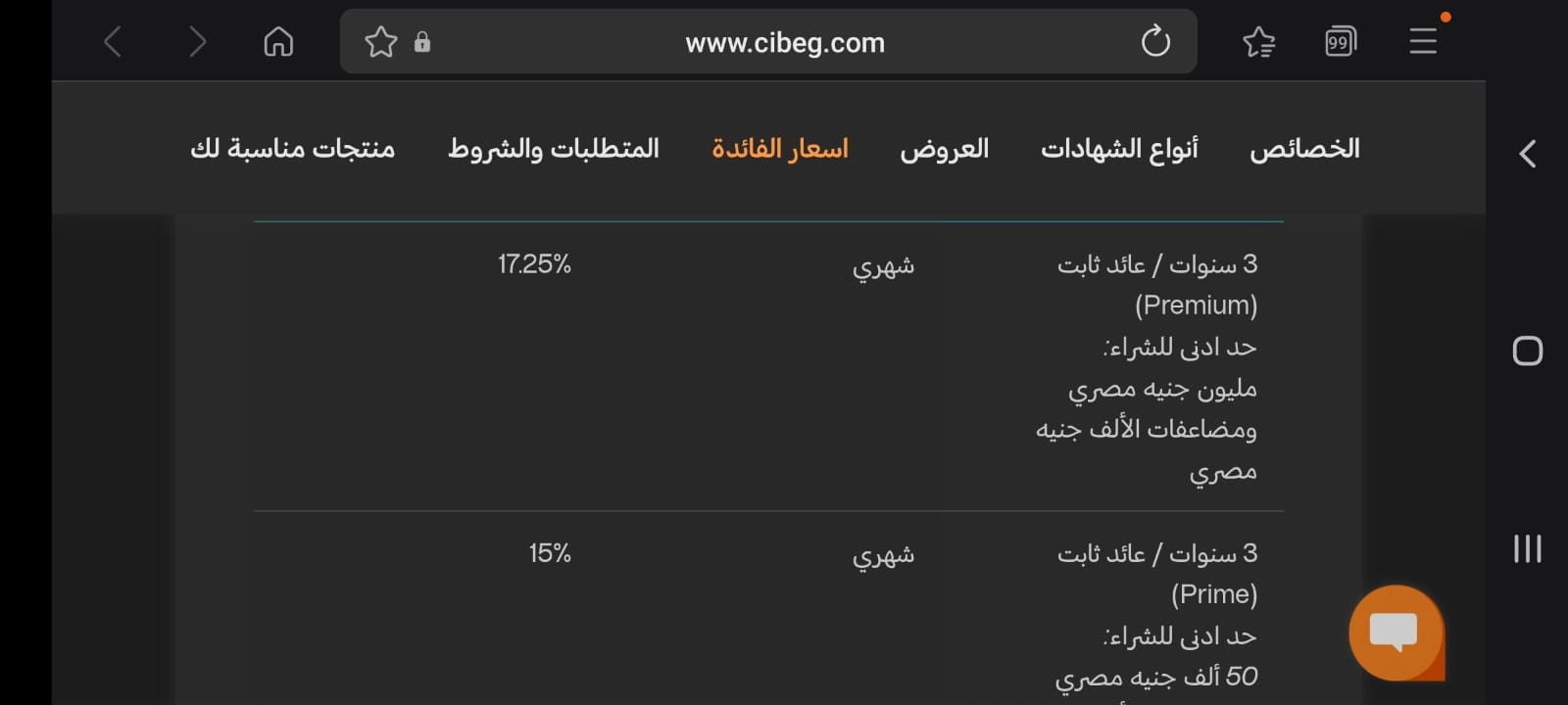 شهادة بريميوم ذات أجل 3 سنوات: خفض الحد الأدنى من 5 ملايين جنيه ليصبح مليون جنيه، بعائد شهري 17.25%%.