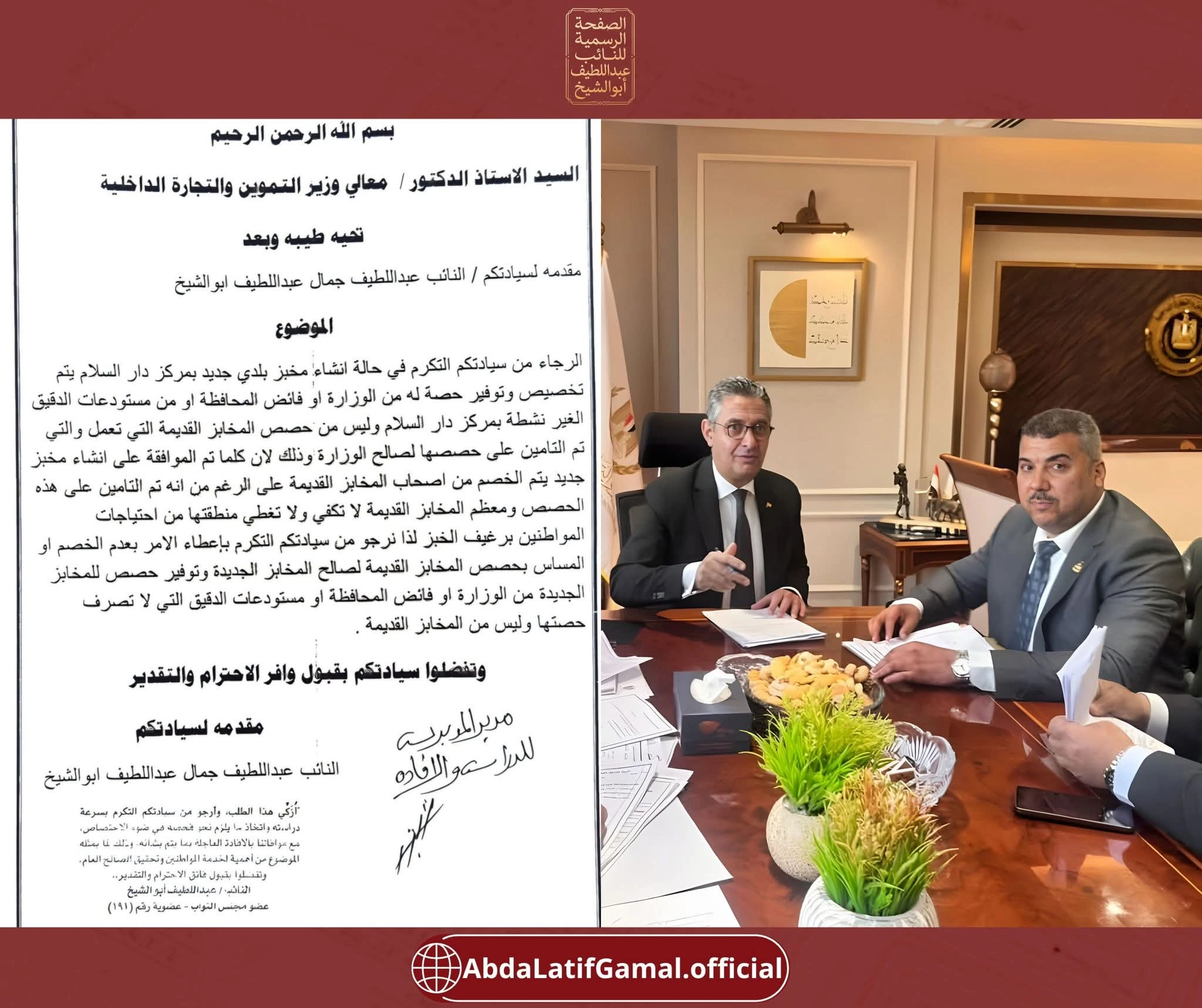 في إطار الدور الرقابي والتشريعي وحرصًا على تلبية احتياجات المواطنين، تقدم النائب عبداللطيف جمال أبوالشيخ، عضو مجلس النواب عن دائرة مركز دار السلام، بطلب رسمي إلى السيد وزير التموين والتجارة الداخلية، بشأن دعم وتطوير منظومة الخبز بالمركز، بما يحقق العدالة في توزيع الخدمة ويضمن وصول الدعم لمستحقيه.