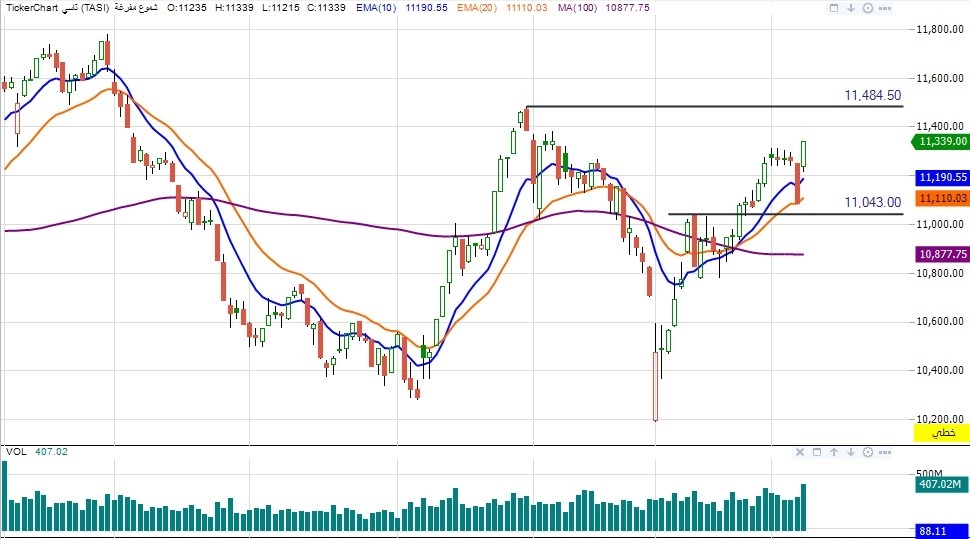 فنيًا، يتحرك المؤشر في اتجاه صاعد على المدى القصير، مع استقراره أعلى مستوى 11,000 نقطة و تحركه اعلي المتوسطات قصيرة المدي (10 , 20) SMA و المتوسط الطويل 100 SMA ، وهو ما يعزز فرص استمرار الصعود خلال الفترة المقبلة.