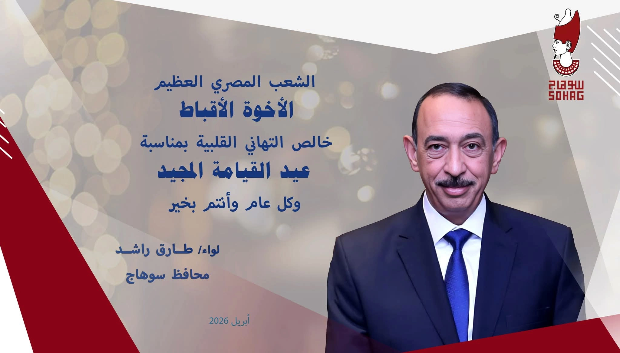 هنأ اللواء طارق راشد محافظ سوهاج، الأخوة الأقباط في مصر عامة، وفي سوهاج بصفة خاصة، وكذا المصريين المقيمين بالخارج، بمناسبة عيد القيامة المجيد.
