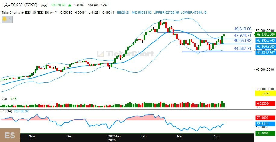 قال “اسلام خميس” عضو الجمعية المصرية للمحللين الفنين و عضو الاتحاد الدولي للمحللين الفنين و مدير قسم التحليل الفني في شركه “الصك” لتداول الأوراق المالية، فى تحليله الفني، فى تحليله لمؤشر السوق المصري الرئيسي EGX30 تعاملات جلسة الخميس الماضي على ارتفاع بنسبة 1%، ليغلق عند مستوى 49,078 نقطة، رابحًا 484 نقطة، وسط أداء إيجابي للأسهم المدرجة، حيث ارتفعت أسعار 115 سهمًا مقابل تراجع 106 أسهم، فيما سجلت قيم التداول نحو 7.8 مليار جنيه .