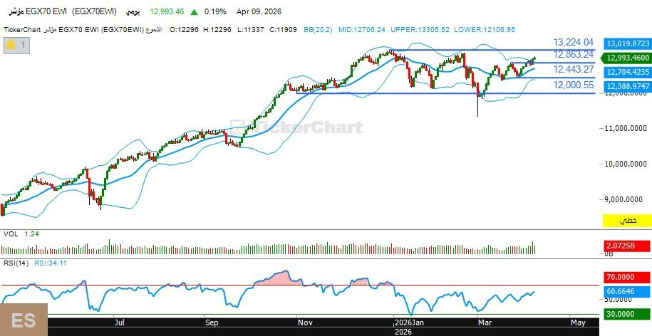 وفيما يتعلق بتحليل مؤشر الأسهم الصغيرة والمتوسطة، فقد أغلق مؤشرEGX70 عند مستوى 12,993 نقطة بنهاية جلسة الخميس الماضي، مرتفعًا بنحو 5 نقاط، مواصلًا تحركاته العرضية في نطاق ضيق قرب مستويات المقاومة الرئيسية، وفق التحليل الفني الذي اعده “اسلام خميس” عضو الجمعية المصرية للمحللين الفنين و عضو الاتحاد الدولي للمحللين الفنين و مدير قسم التحليل الفني في شركه “الصك” لتداول الأوراق المالية، فى تحليله الفني .