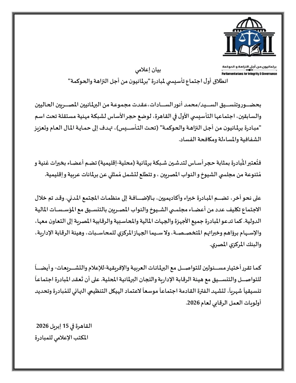 في خطوة جديدة نحو دعم مبادئ الشفافية وتعزيز آليات الرقابة، انطلق بالقاهرة الاجتماع التأسيسي الأول لمبادرة “برلمانيون من أجل النزاهة والحوكمة” (تحت التأسيس)، وذلك بحضور وتنسيق محمد أنور السادات، وبمشاركة مجموعة من البرلمانيين المصريين الحاليين والسابقين.
