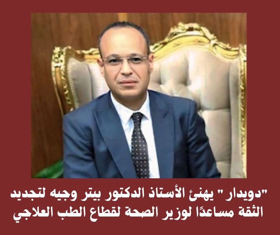 تقدم السيد الدكتور عمرو دويدار، وكيل وزارة الصحة بسوهاج، بخالص التهنئة إلى الأستاذ الدكتور بيتر وجيه، مساعد وزير الصحة لقطاع الطب العلاجي، وذلك بمناسبة تجديد ثقة معالي الأستاذ الدكتور خالد عبد الغفار، وزير الصحة والسكان، لسيادته في هذا المنصب.
