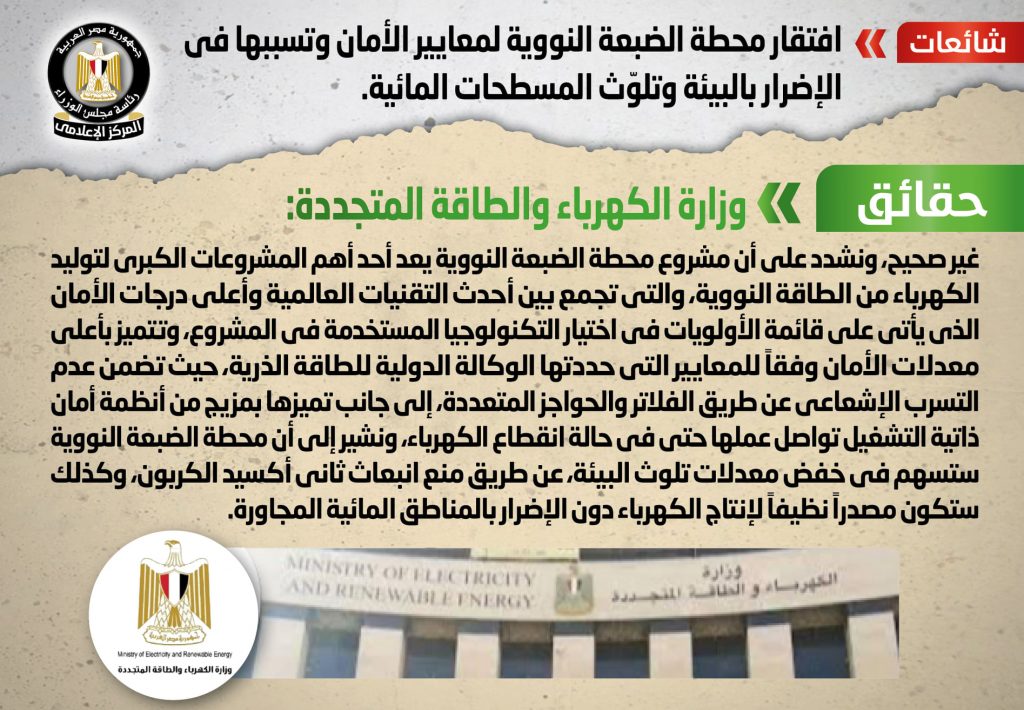 تداولت بعض المواقع الإلكترونية وصفحات التواصل الاجتماعي أنباء تزعم افتقار محطة الضبعة النووية لمعايير الأمان وتسببها في الإضرار بالبيئة وتلوّث المسطحات المائية، وقد قام المركز الإعلامي لمجلس الوزراء بالتواصل مع وزارة الكهرباء والطاقة المتجددة، والتي نفت تلك الأنباء، مُؤكدةً أنه لا صحة لافتقار محطة الضبعة النووية لمعايير الأمان أو تسببها في الإضرار بالبيئة وتلوّث المسطحات المائية، مُشددةً على أن مشروع محطة الضبعة النووية يعد أحد أهم المشروعات الكبرى لتوليد الكهرباء من الطاقة النووية، والتي تجمع بين أحدث التقنيات العالمية وأعلى درجات الأمان الذي يأتي على قائمة الأولويات في اختيار التكنولوجيا المستخدمة في المشروع، وتتميز بأعلى معدلات الأمان وفقاً للمعايير التي حددتها الوكالة الدولية للطاقة الذرية، حيث تضمن عدم التسرب الإشعاعي عن طريق الفلاتر والحواجز المتعددة، إلى جانب تميزها بمزيج من أنظمة أمان ذاتية التشغيل تواصل عملها حتى في حالة انقطاع الكهرباء، مُشيرةً إلى أن محطة الضبعة النووية ستسهم في خفض معدلات تلوث البيئة، عن طريق منع انبعاث ثاني أكسيد الكربون، وكذلك ستكون مصدراً نظيفاً لإنتاج الكهرباء دون الإضرار بالمناطق المائية المجاورة.