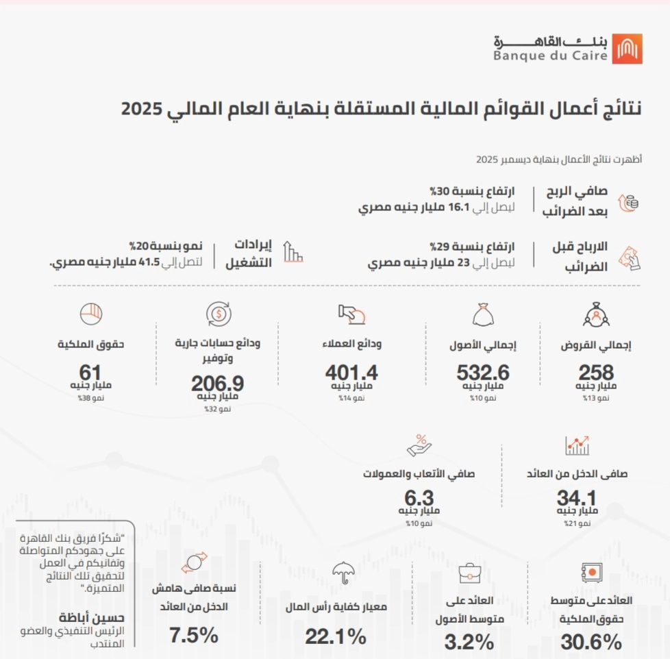 نتائج أعمال بنك القاهرة بنهاية العام المالي 2025.. ارتفاع صافي الربح بنسبة 30% ليصل إلي 16.1 مليار جنيه مصري