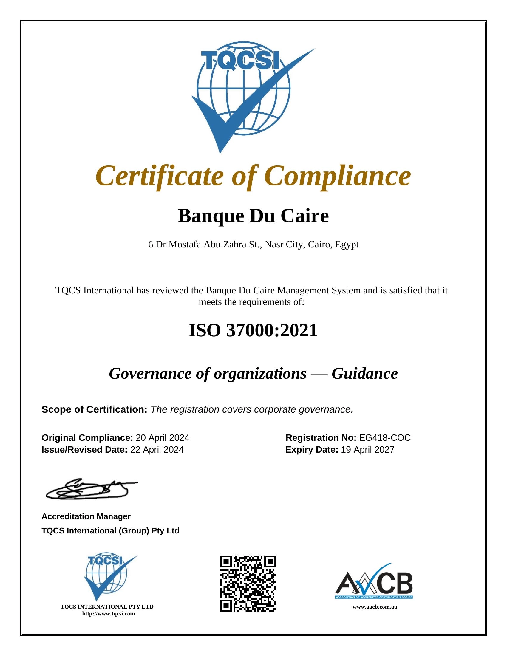 بنك القاهرة يمدد اعتماد شهادة الأيزو في مجال الحوكمة المؤسسية ISO 37000 للعام الثانى على التوالى