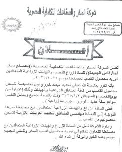 شركة السكر والصناعات التكاملية المصرية تعلن موعد بدء توريد محصول القصب لموسم 2024/2025