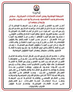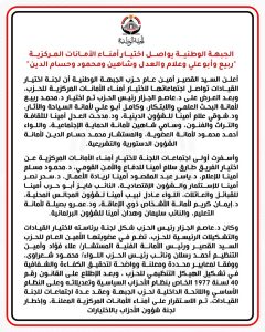 الجبهة الوطنية يواصل اختيار أمناء الأمانات المركزية “ربيع وأبو علي وعلام والعدل وشاهين ومحمود وحسام الدين”