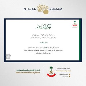 فى التقييم السنوى للمركز الوطنى السعودى ” النيل للطيران ” تحصل على 98% لأمن المسافرين لعام 2024