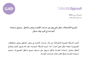 المصرية للاتصالات: عطل تقني يؤثر على خدمات الإنترنت ببعض المناطق