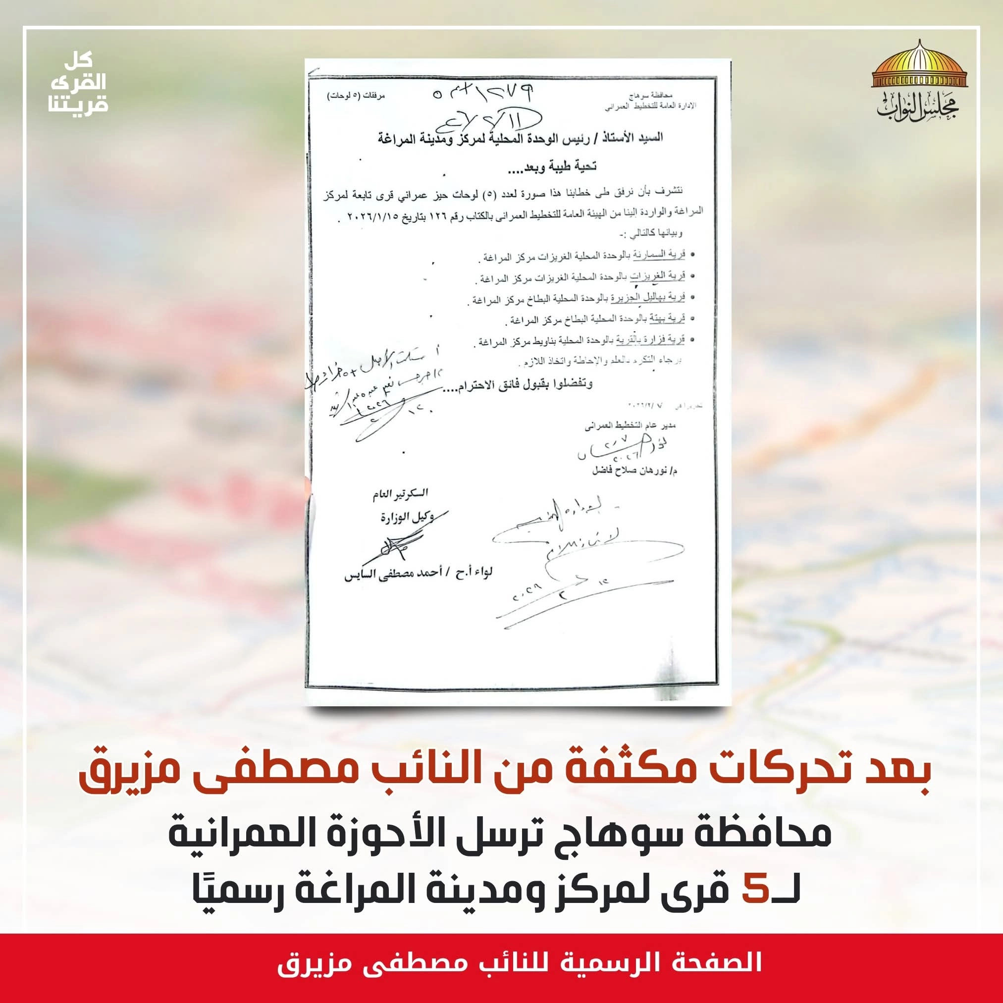 بعد تحركات مكثفة من النائب مصطفى مزيرق.. محافظة سوهاج ترسل الأحوزة العمرانية لـ5 قرى لمركز ومدينة المراغة رسميًا