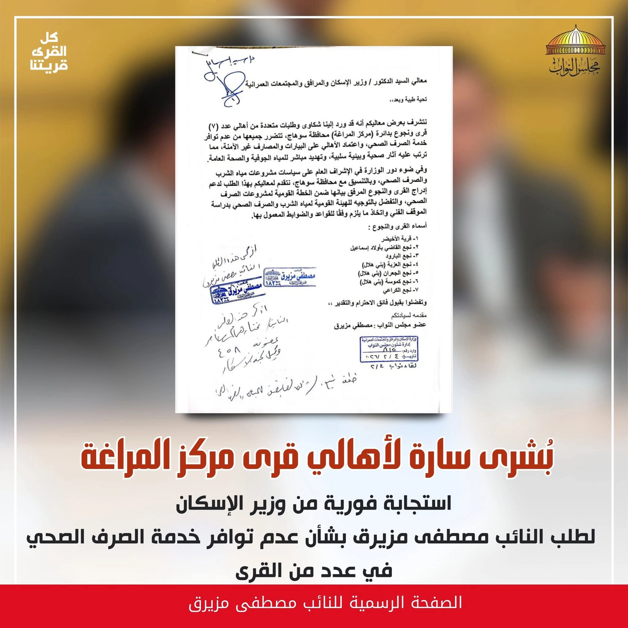 استجابة فورية من وزير الإسكان لطلب النائب مصطفى مزيرق بشأن عدم توافر خدمة الصرف الصحي في عدد من القرى